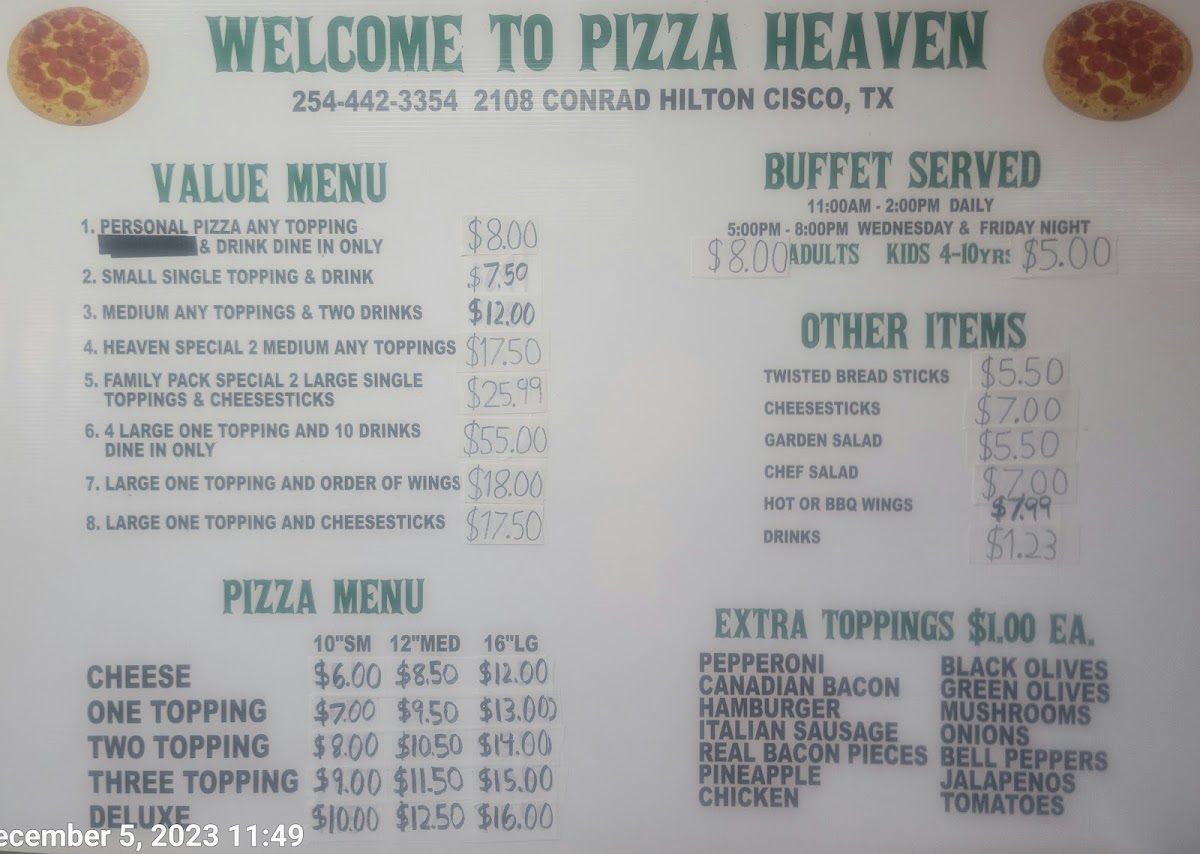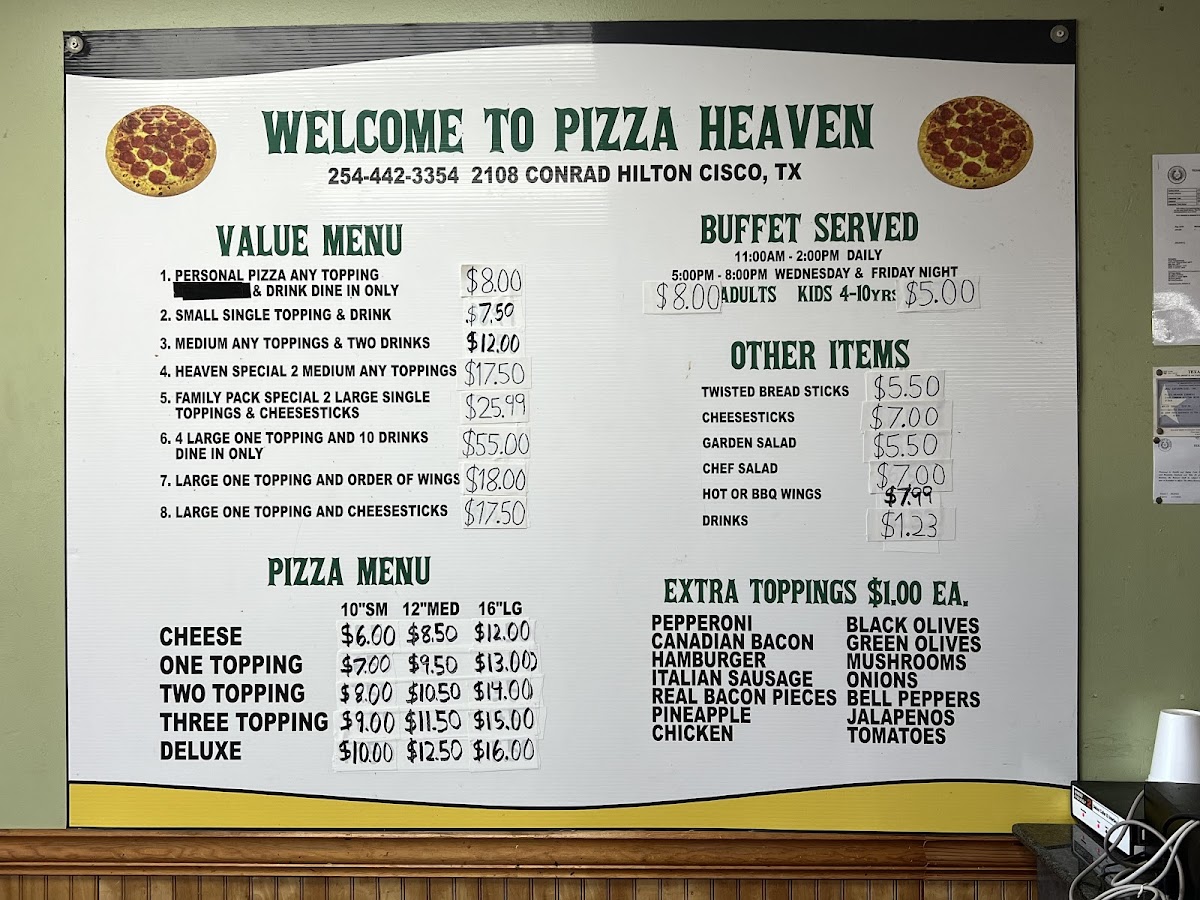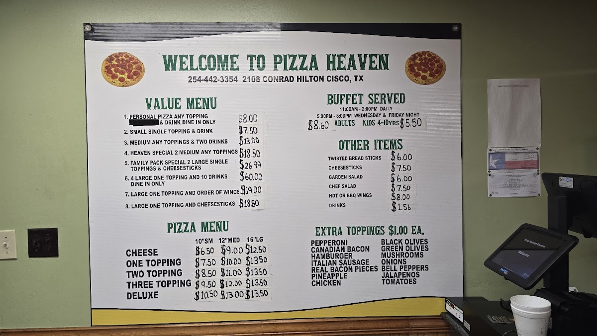 Pizza Heaven offers a straightforward, welcoming menu centered around classic pizza favorites and casual dining staples. The selection features everything from simple cheese pizzas to more loaded options like deluxe and multi-topping pies, ideal for sharing with family or friends. Complementing the pizzas, you'll find lighter options such as a fresh salad bar and specialty items like dessert pizzas with cinnamon sugar cream cheese—a nice contrast to the savory slices.